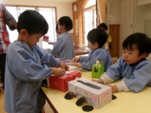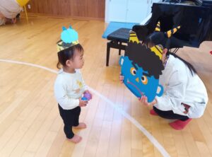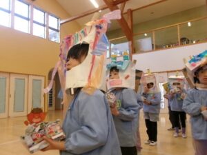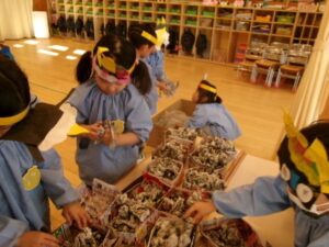 事前に鬼のお面を作ったり、鬼を退治するための豆作りも子ども達がおこないました!
