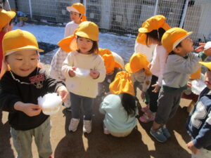 園庭に雪が積もりました。「すごーい!」「真っ白だよ!」雪に大喜びの子ども達。
